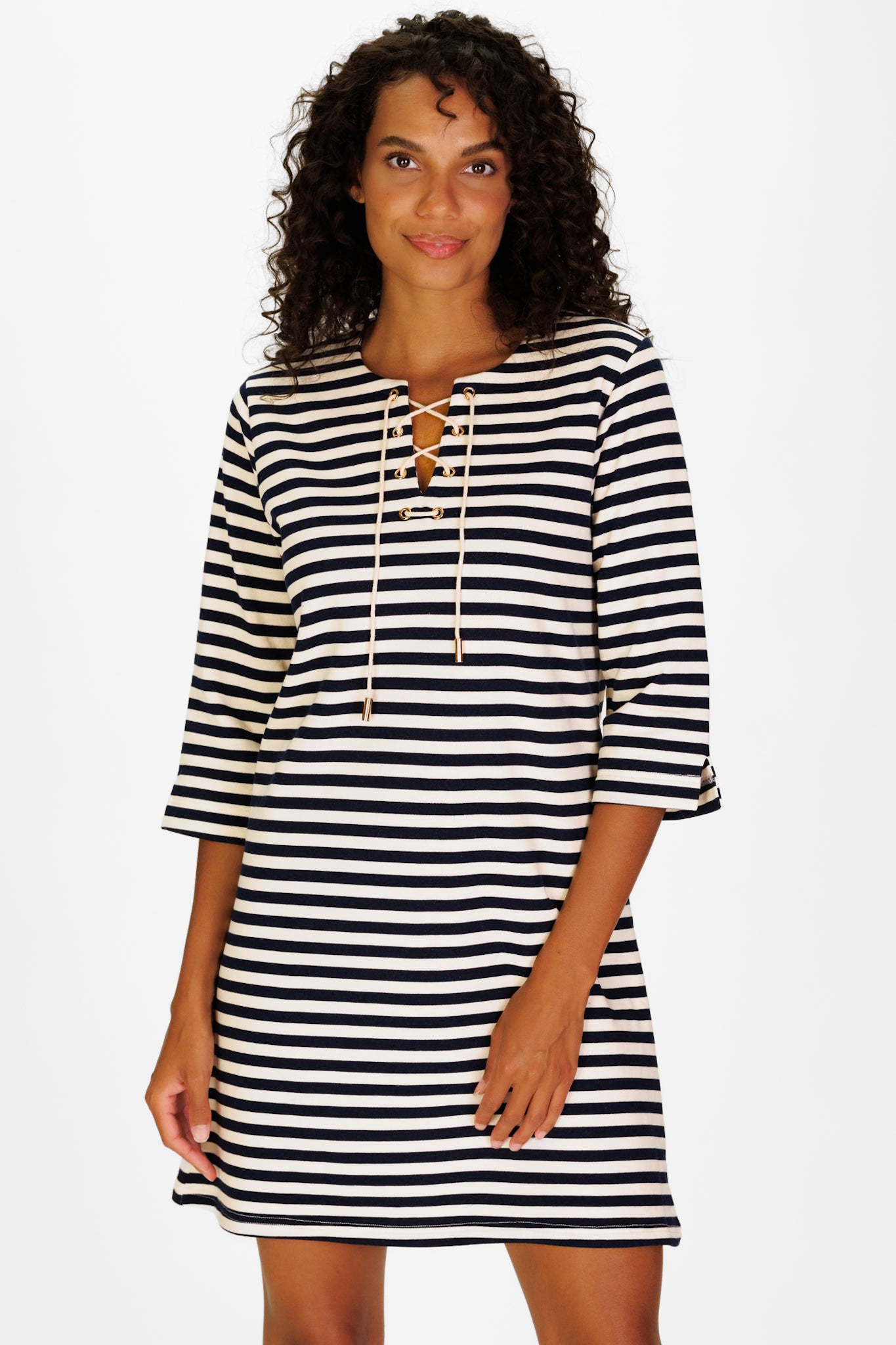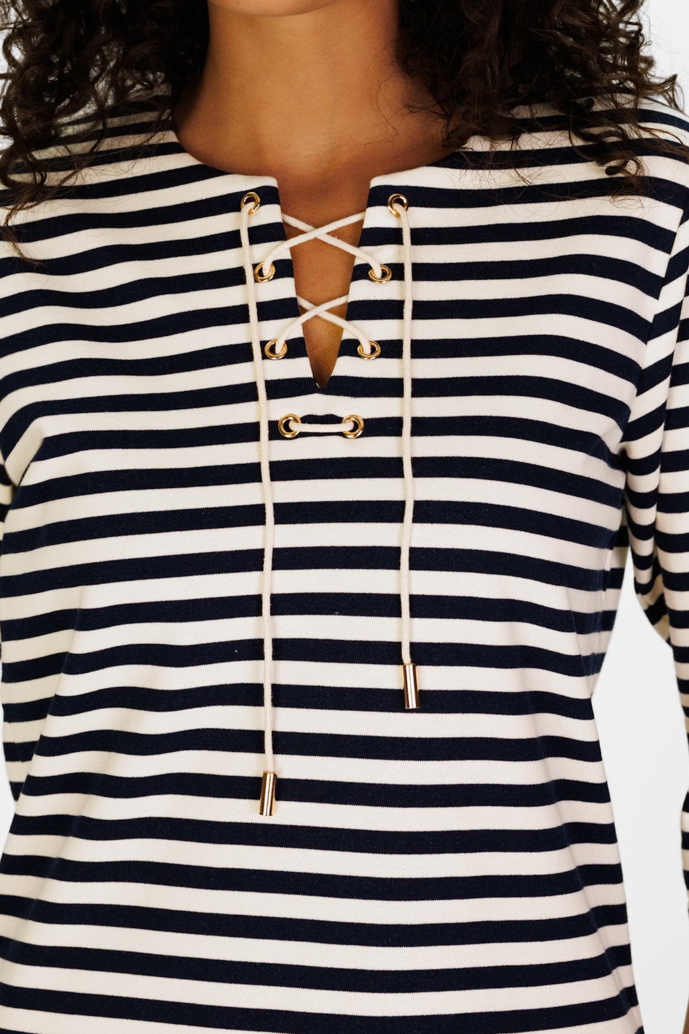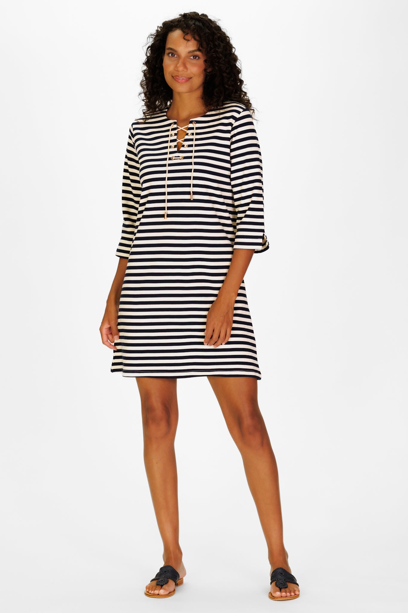 Meet the Teddy Dress, a timeless navy-and-white striped dress crafted the Duffield Lane way—soft, substantial, and effortlessly flattering. Made from premium French Terry fabric, this casual yet chic dress drapes beautifully and delivers the lived-in softness you love. A stylish lace-up V-neckline adds a playful nautical touch, making it perfect for everyday wear, weekends by the water, or relaxed spring and summer outings.