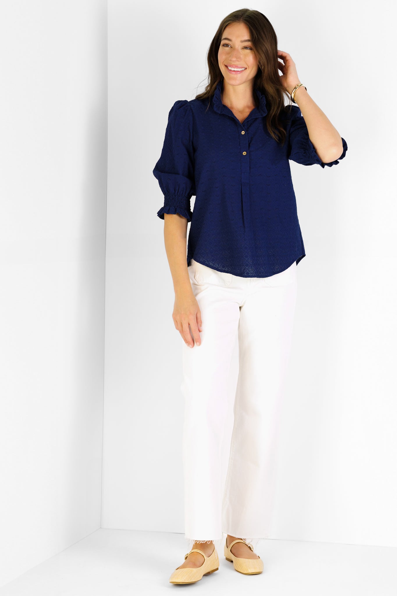 Meet the women's Percy, a preppy, polished popover top designed to make a subtle yet striking statement. Featuring puff sleeves, a ruffle collar, and a smocked cuff, this elevated classic brings timeless style with a modern twist. Gold button detailing adds a touch of sophistication, making it easy to dress up or down.