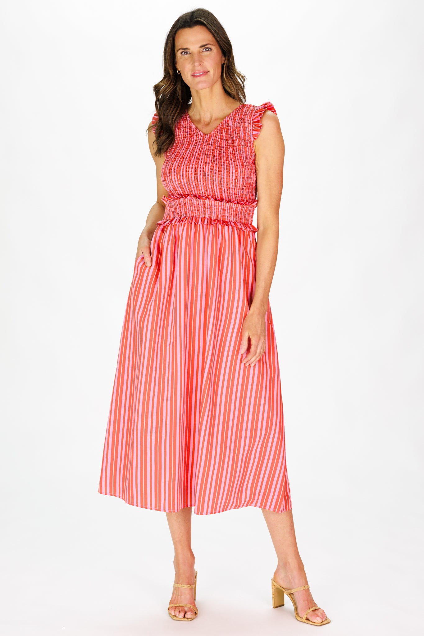 The women's Shiloh Dress in Red & Pink Stripe combines comfort, style, and playful detailing in one flattering silhouette. Its smocked stretch bodice moves with you for a flexible, figure-flattering fit, while vertical stripes create a clean, lengthening look. Delicate ruffle shoulder details add a touch of charm, making this maxi dress perfect for casual outings, warm-weather events, or resort-ready dressing. Plus, the versatile neckline lets you wear it either as a v-neck or scoop neck, adding even more styling options.