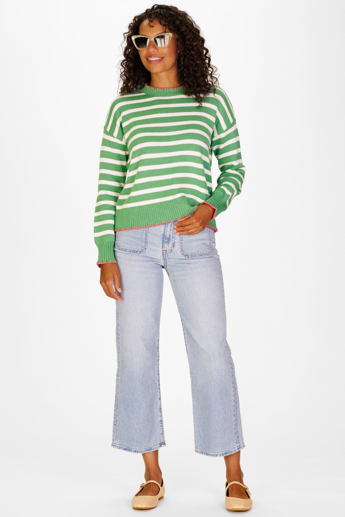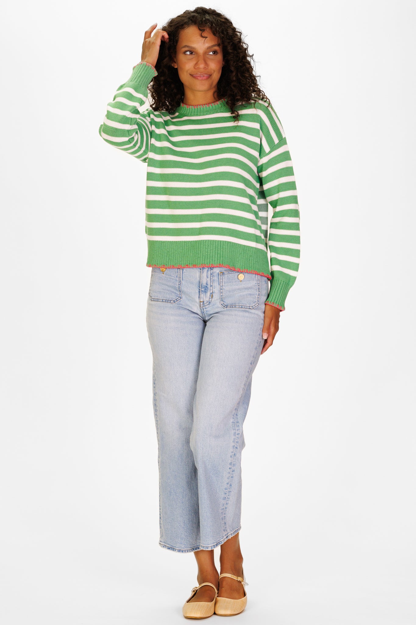 This green women's blanket stitch cotton sweater highlights everything we love about heirloom 100% cotton: substantial, breathable, and beautifully made. The relaxed drop-shoulder silhouette creates an easy, effortless fit, while pink contrast blanket stitching and stripe in white adds a handcrafted, elevated finish. Designed for everyday wear, this women’s cotton sweater holds its shape, stays soft, and skips the dry cleaner entirely; never pilling, always washable.