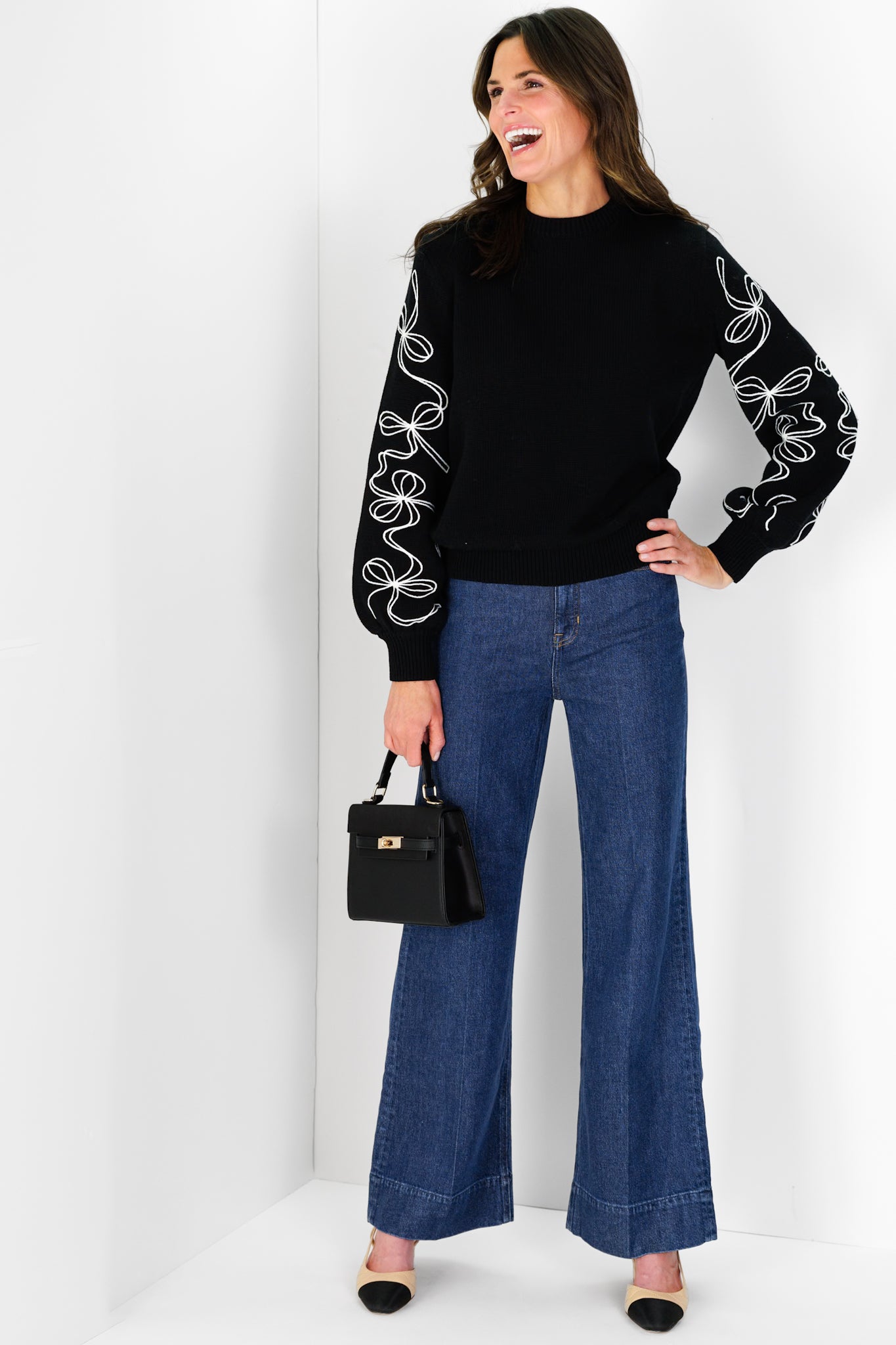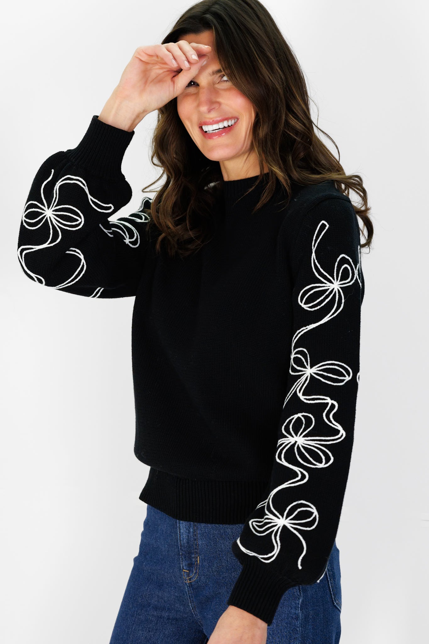 Festive and fun, the women's Bow Sleeve Sweater is made for the celebration season. Featuring statement balloon sleeves adorned with ivory embroidered bows, this 100% cotton knit adds a playful twist to a timeless silhouette. Pair it with denim for casual charm or dress it up with a skirt for your next holiday soirée.