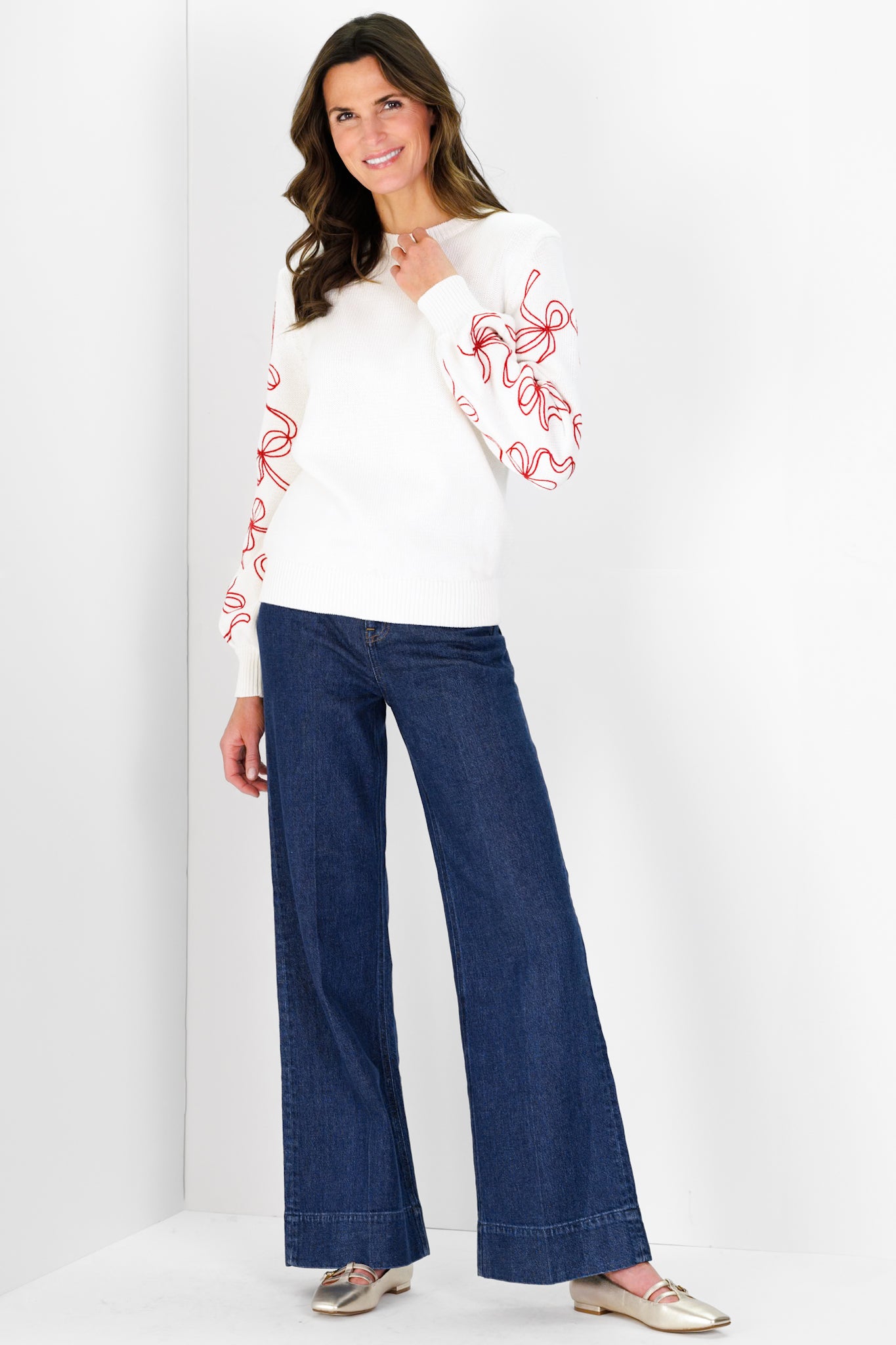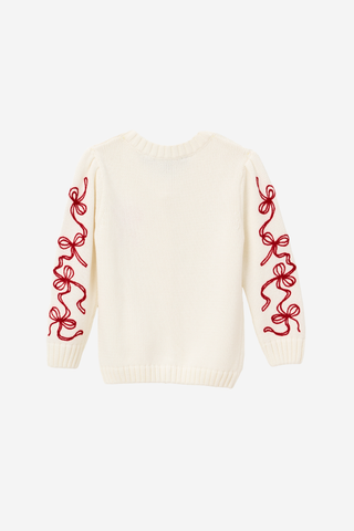 Festive and fun, the women's Bow Sleeve Sweater is made for the celebration season. Featuring statement balloon sleeves adorned with red embroidered bows, this 100% cotton knit adds a playful twist to a timeless silhouette. Pair it with denim for casual charm or dress it up with a skirt for your next holiday soirée.