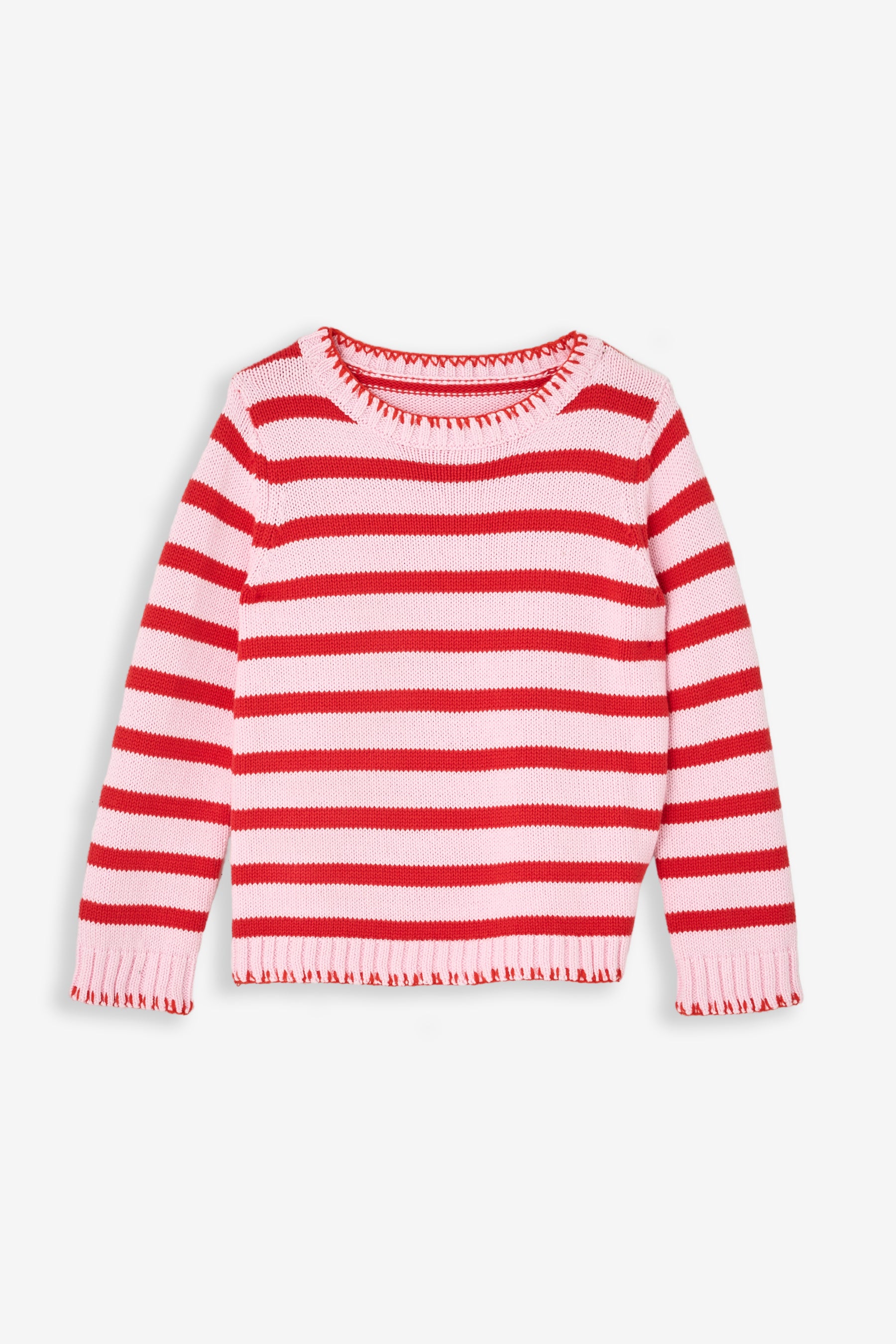 Bright, cozy, and full of personality, this girls’ striped cotton sweater is a wardrobe must-have for cool-weather play, school days, and everyday layering. Crafted from heirloom 100% cotton, the sweater is soft, breathable, and durable for long-lasting wear. The pink and red-orange stripes paired with contrast blanket stitch detailing give it a playful, polished look, while ribbed neckline, cuffs, and hem provide structure and comfort. Fully machine washable, this sweater is as practical as it is charming.