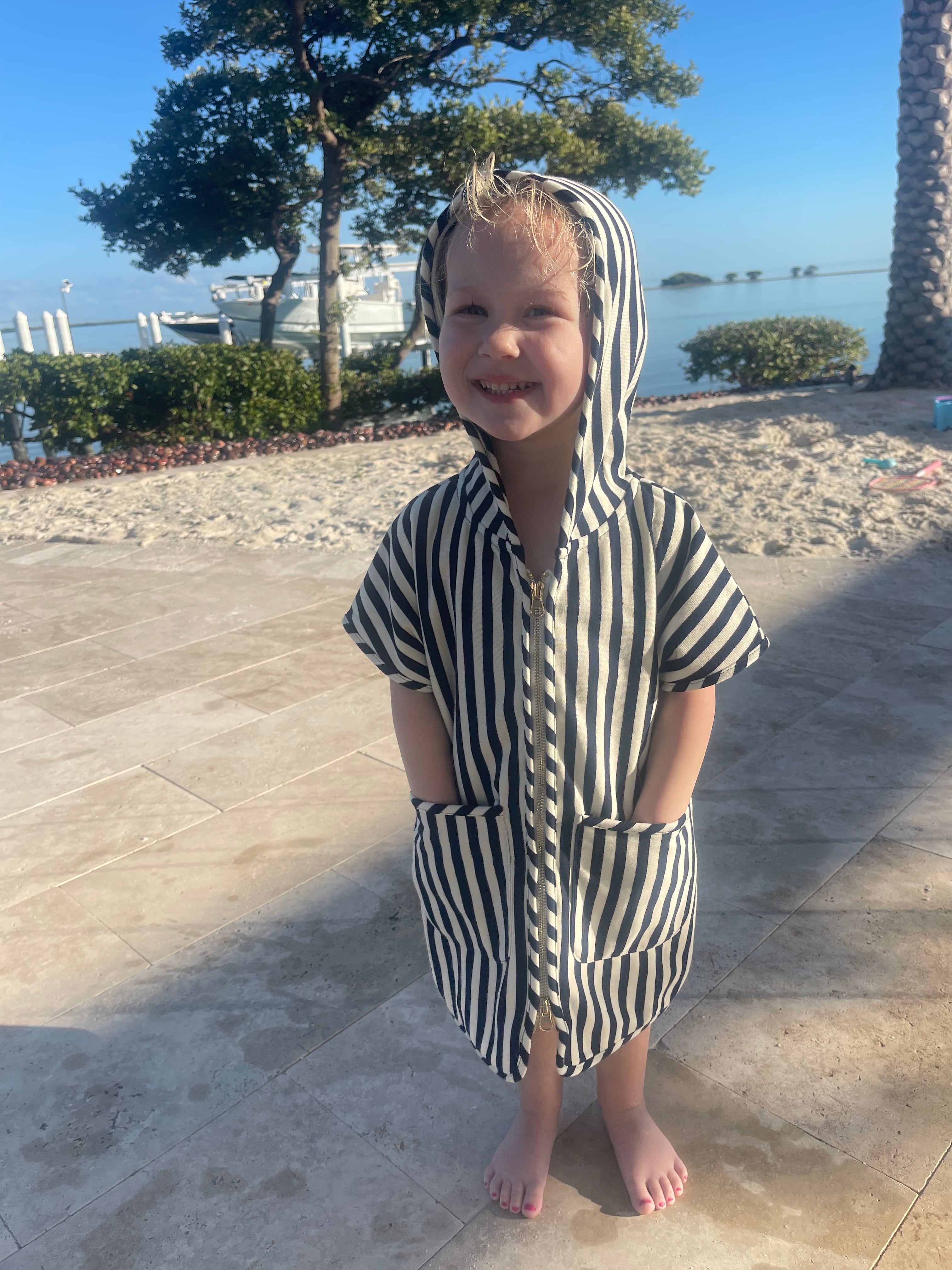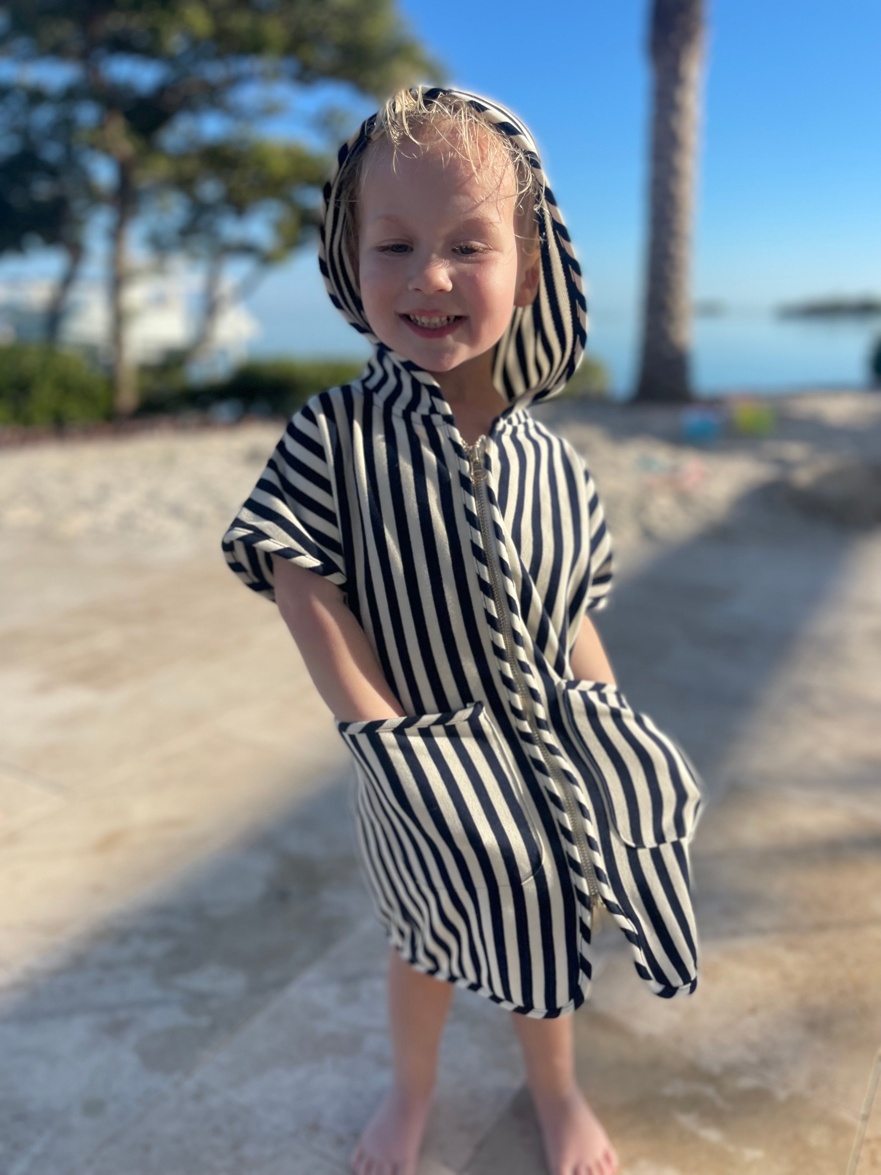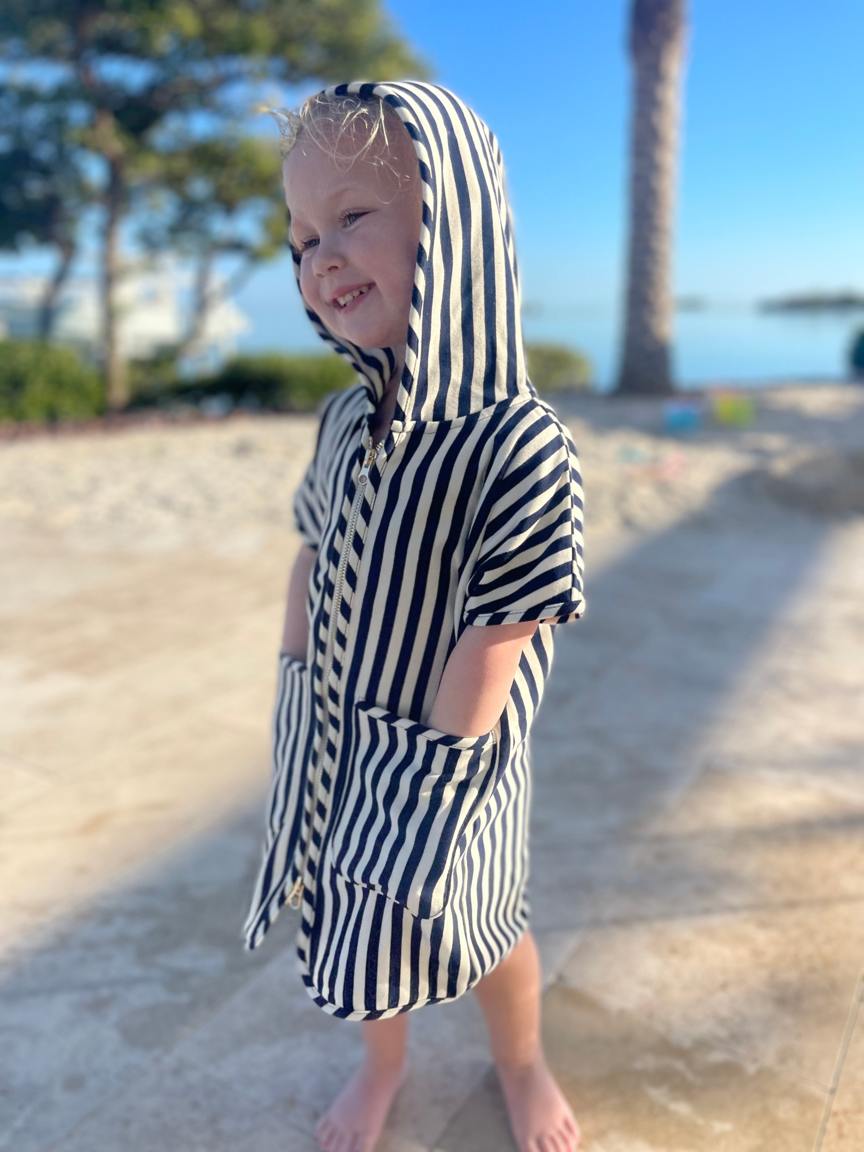 Meet the first-ever Duffield Lane children's cover-up, designed for comfort, style, and sunny-day adventures. Crafted from our soft, cozy signature French Terry fabric in navy and white stripe, this cover-up feels comforting after a swim while staying lightweight and breathable. The relaxed hooded silhouette makes it easy to throw on, and the roomy front pockets are perfect for little treasures, snacks, or chilly hands. Made for poolside fun, beach days, and warm-weather play, this versatile cover-up quickly becomes a go-to piece in a summer wardrobe.