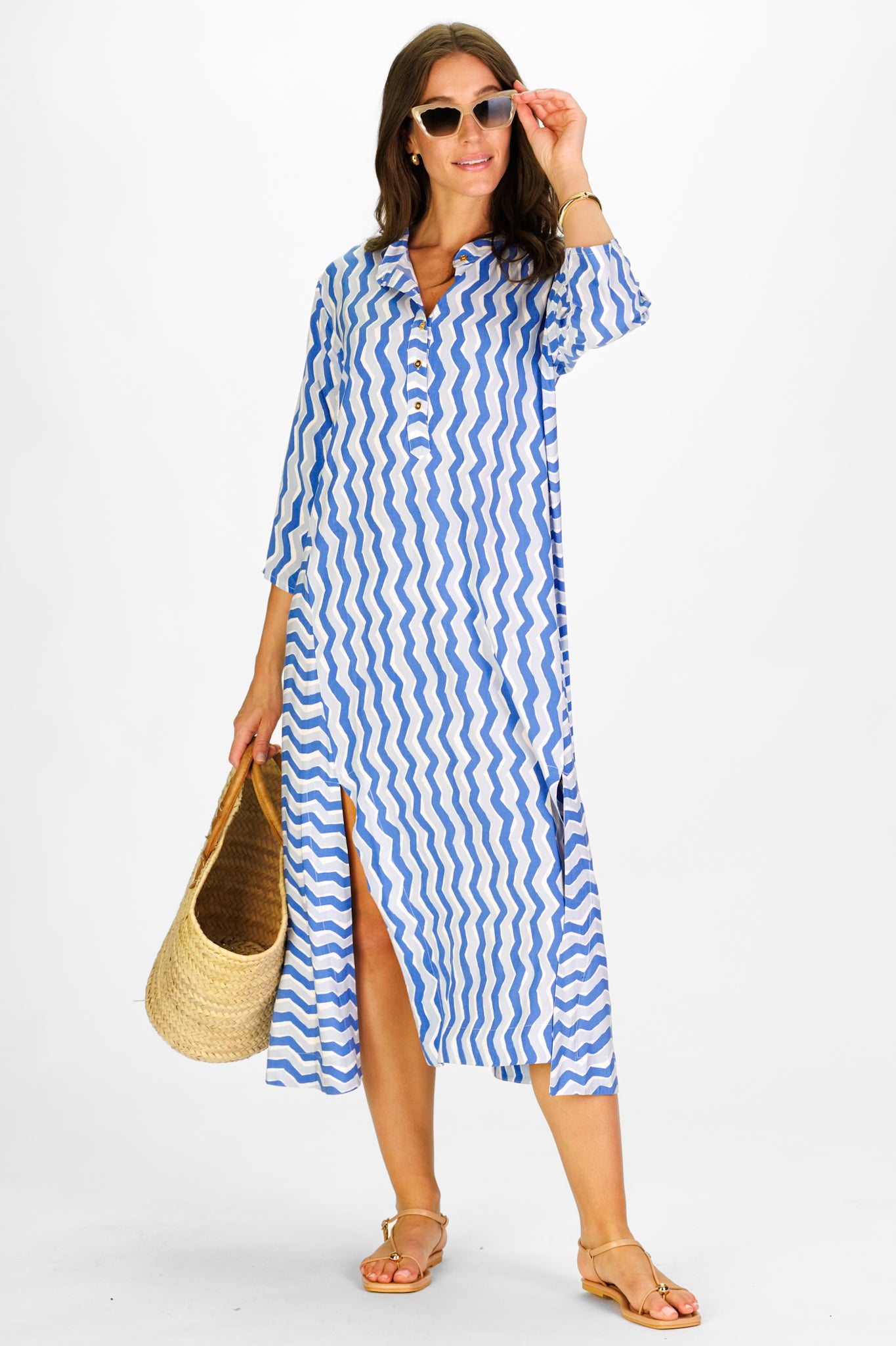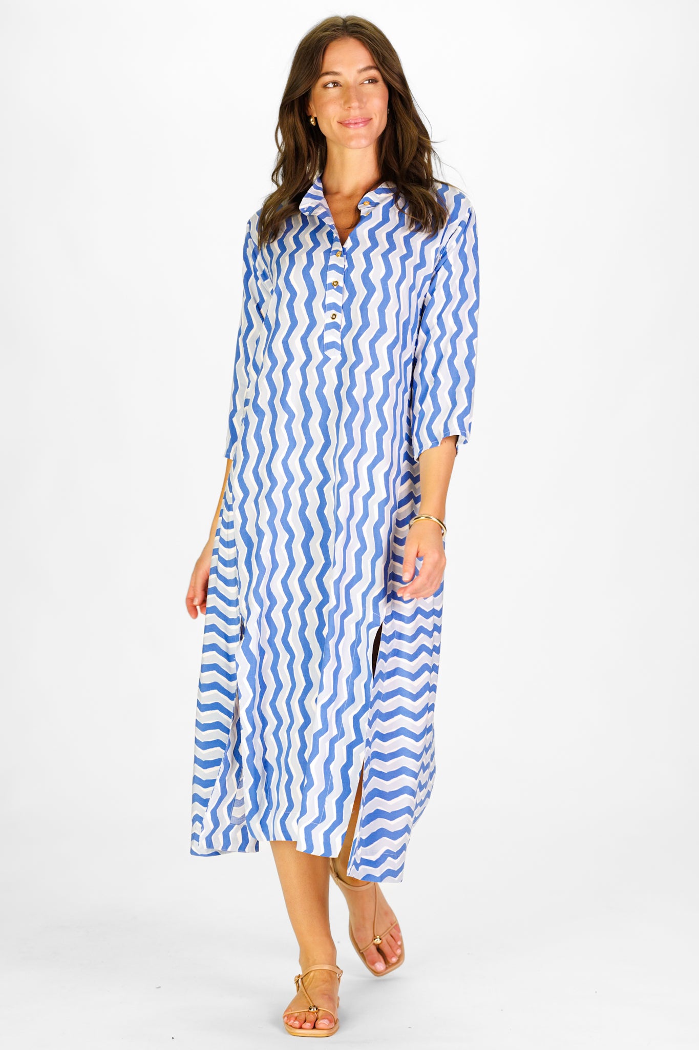 Elevate your everyday style with the women's Rowan Dress, an easy, breezy midi dress that perfectly balances casual comfort and refined elegance. Designed to move with you, this dress features a waving chevron pattern in blue hues with contrasting chevron side panels for a flattering, stylish silhouette that turns heads.