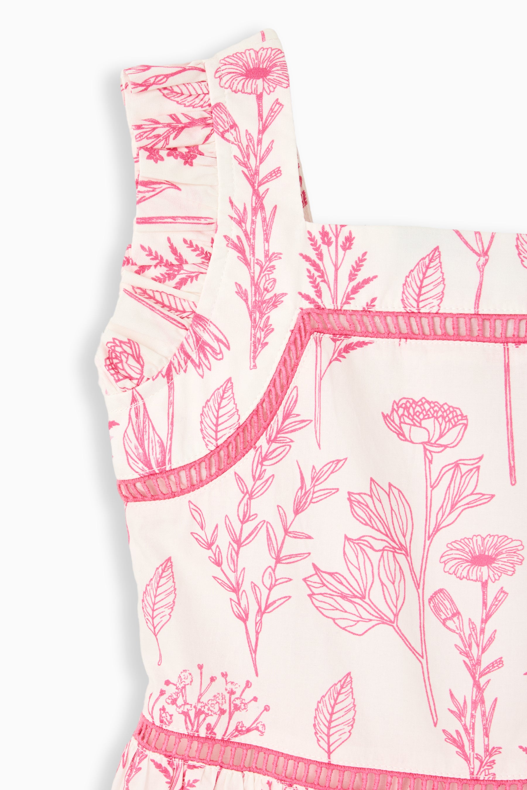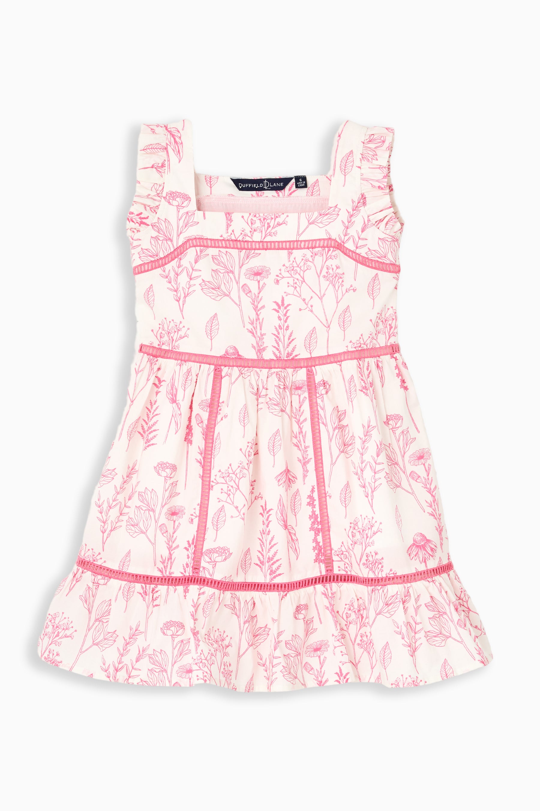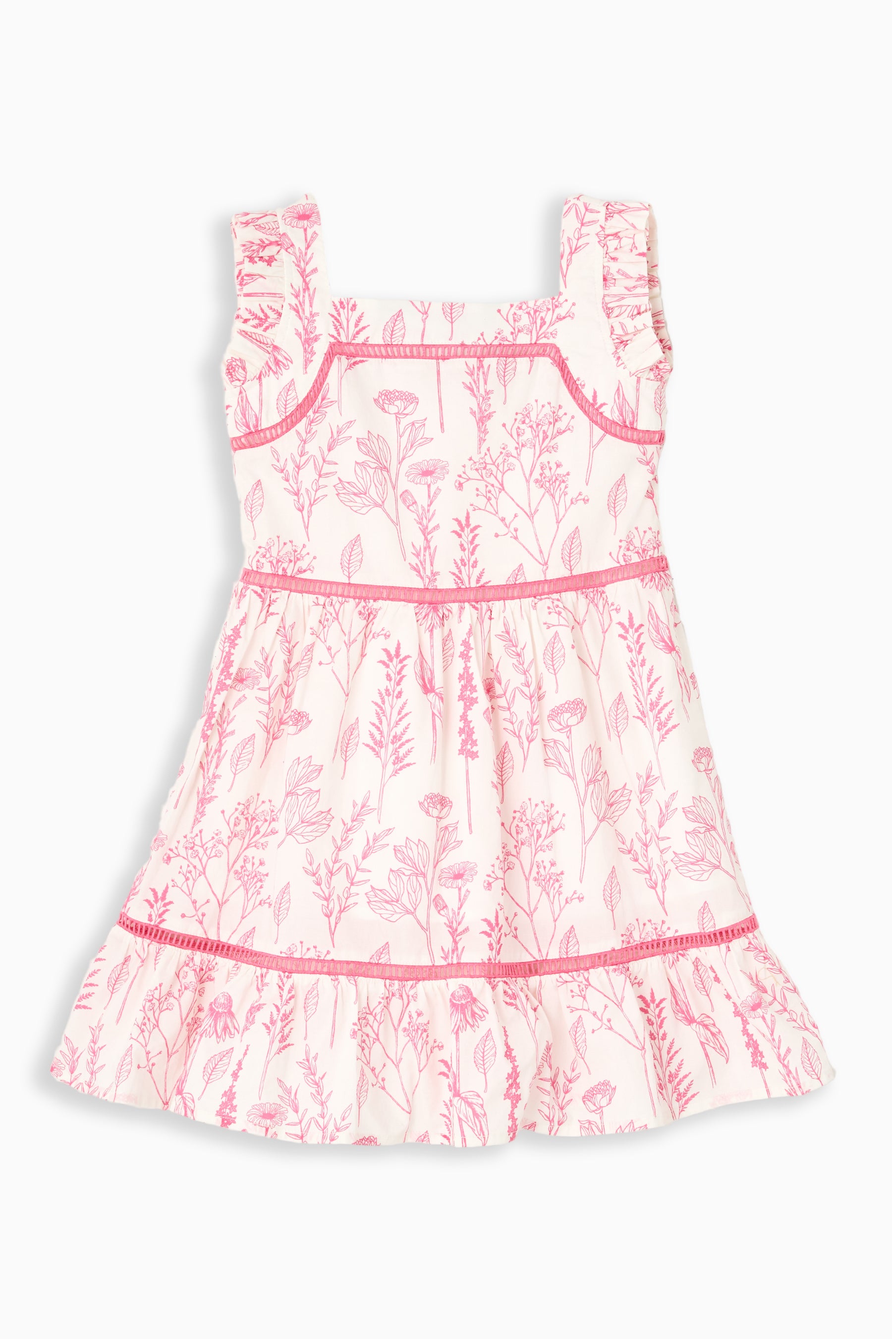 The Girls Estella Dress is sweet, playful, and designed for twirls. Featuring a classic square neckline and tiered skirt, this girls’ dress offers a comfortable, easy-to-wear fit perfect for playdates, birthday parties, or warm-weather outings. The Pink Floral Toile print keeps the look soft and feminine, while delicate ladder lace trim adds an extra touch of charm. The Estella Dress is made to move with her, making it an effortless choice for everyday wear or special occasions.