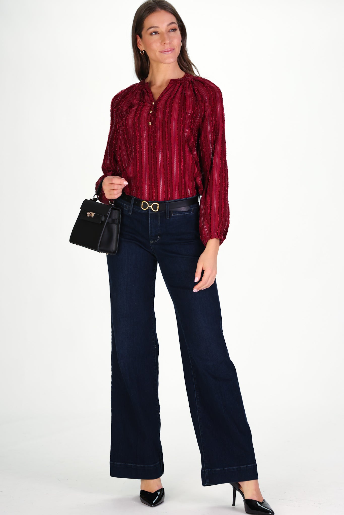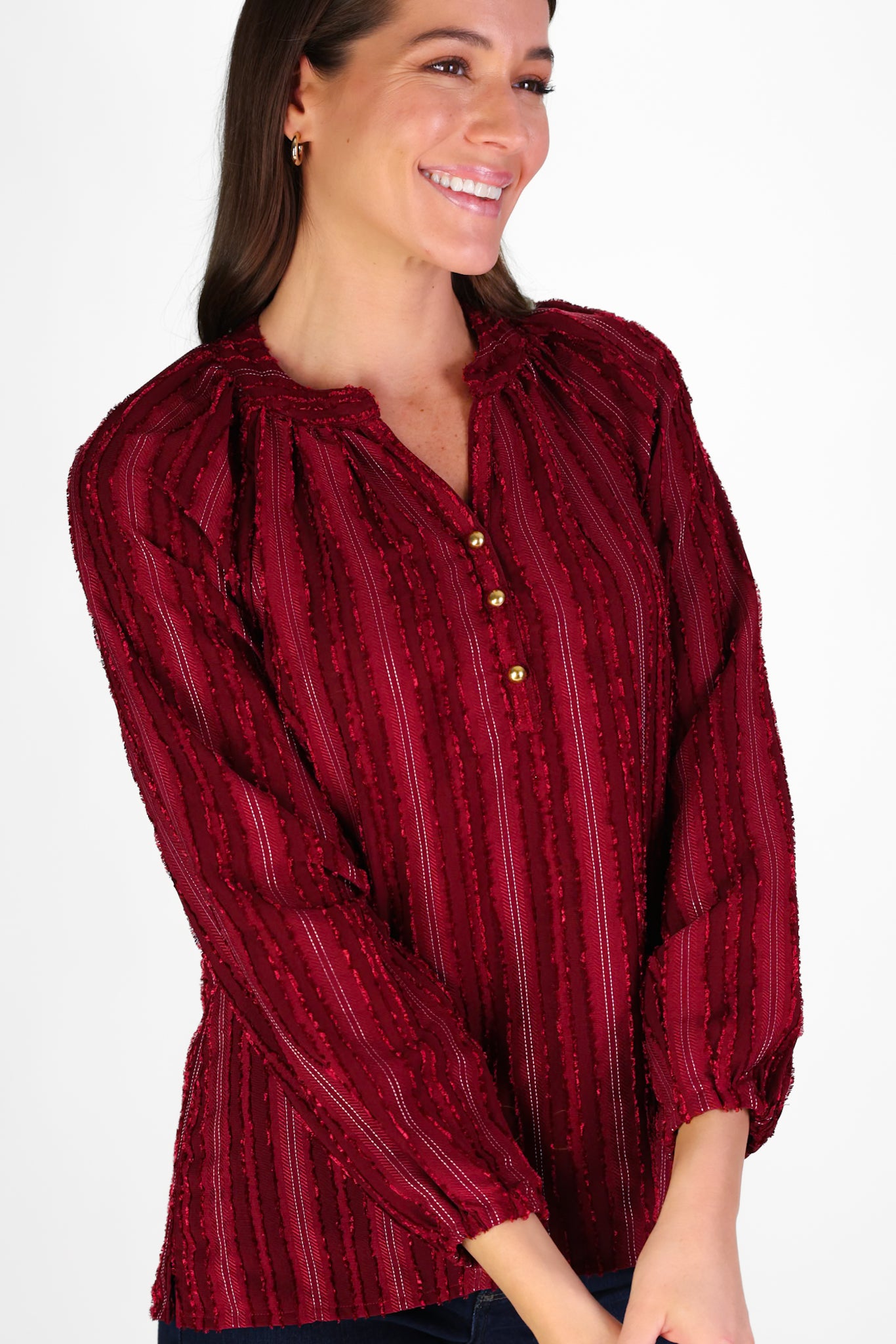 The women's Carlisle Top in cranberry textured stripe is a wardrobe essential with a luxurious twist. Its fabric is lightweight yet refined, it’s the perfect mix of easy and elevated this holiday season. Gold button accents at the neckline add just the right touch of polish, a true wear-everywhere favorite.