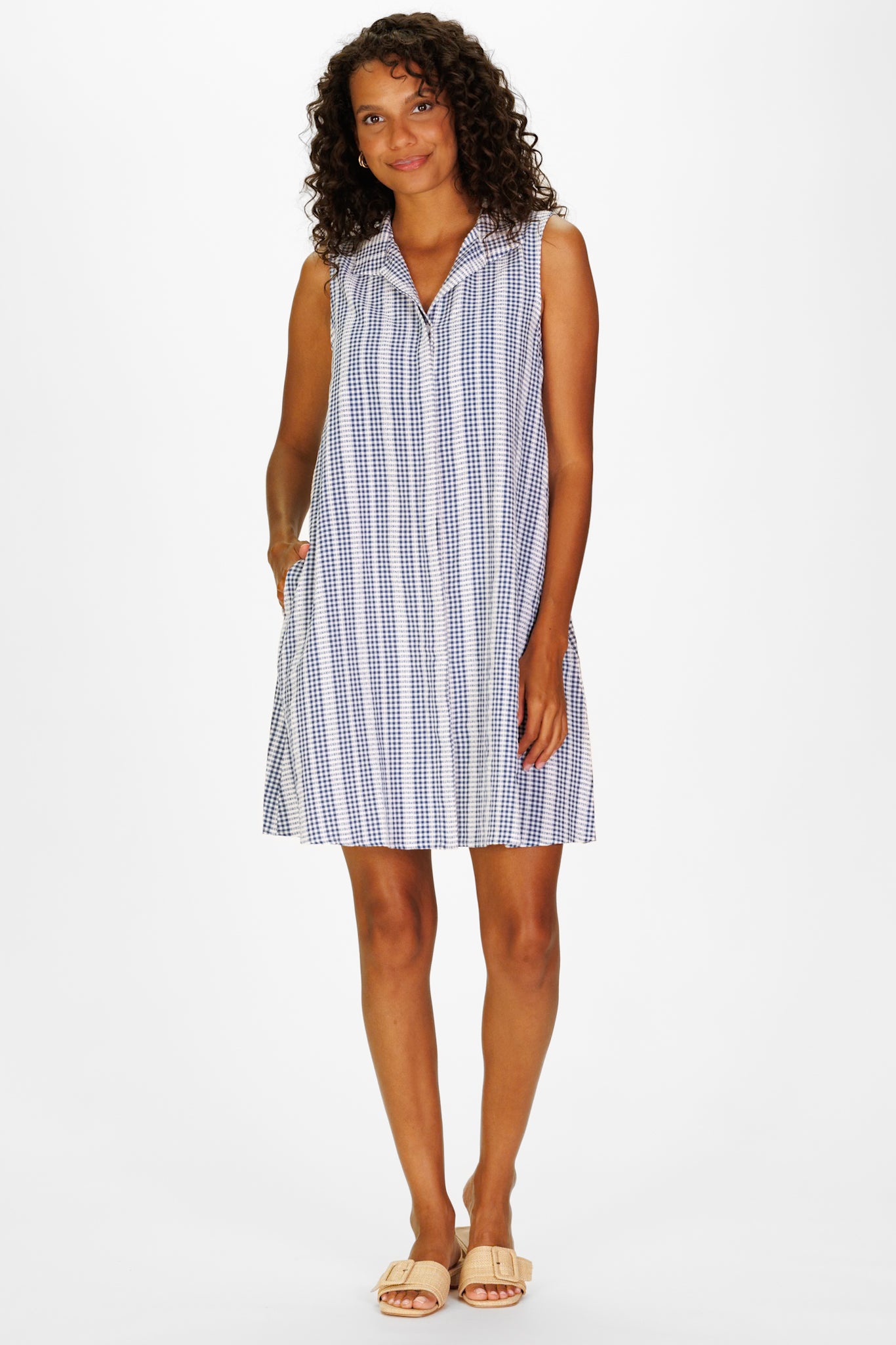 The women's Jan Dress is an instant classic designed for polished, everyday style. This navy gingham style features a flattering swingy silhouette that moves beautifully while maintaining a tailored look. Effortless yet refined, it’s the perfect sleeveless dress for warm days, weekend outings, or casual dinners.
