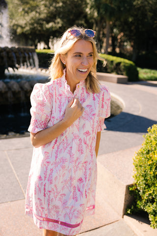 Preppy, polished, and effortlessly chic, the women's Percy Popover Top in Pink Floral Toile is a timeless wardrobe staple with elevated details. Designed to make a statement, this classic popover blouse features puff sleeves, a ruffle collar, and smocked cuffs for a refined, feminine silhouette. Finished with gold button accents, our Percy Popover blends traditional tailoring with modern charm.