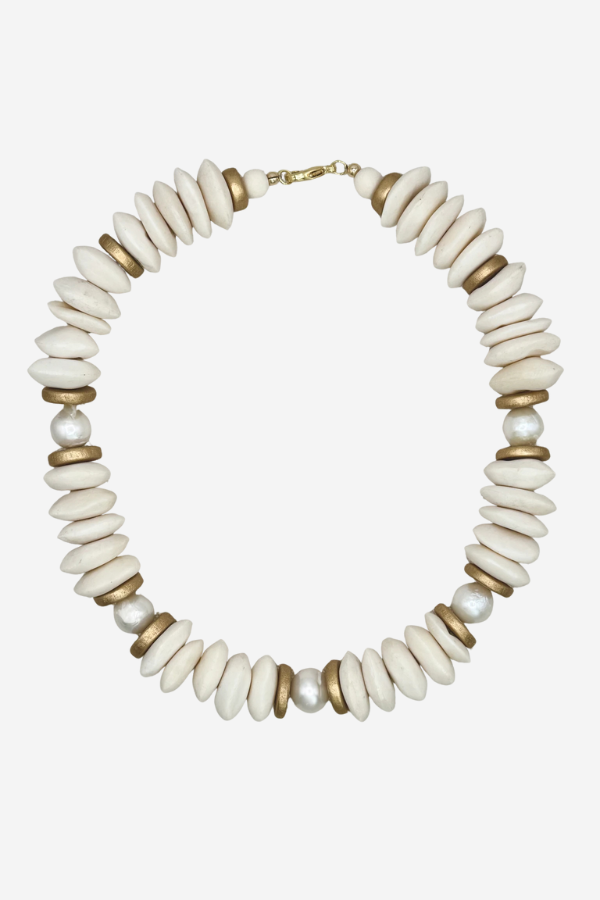 Refined yet worldly—the Classic Lagos 5 Pearl Collar Necklace pairs smooth bone beads with warm coconut wood details for a naturally elevated look. Five luminous freshwater baroque pearls add a soft shimmer, striking the perfect balance between organic texture and timeless polish.