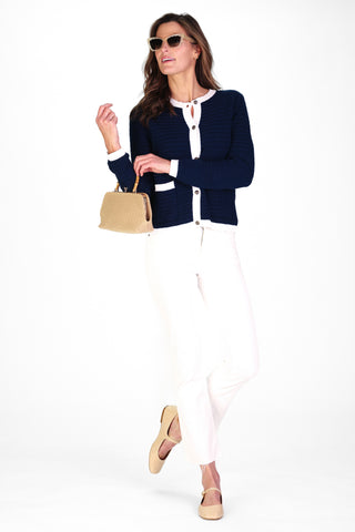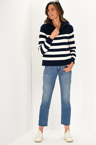 Navy and Ivory Stripe Cotton Blaire Quarter Zip Sweater