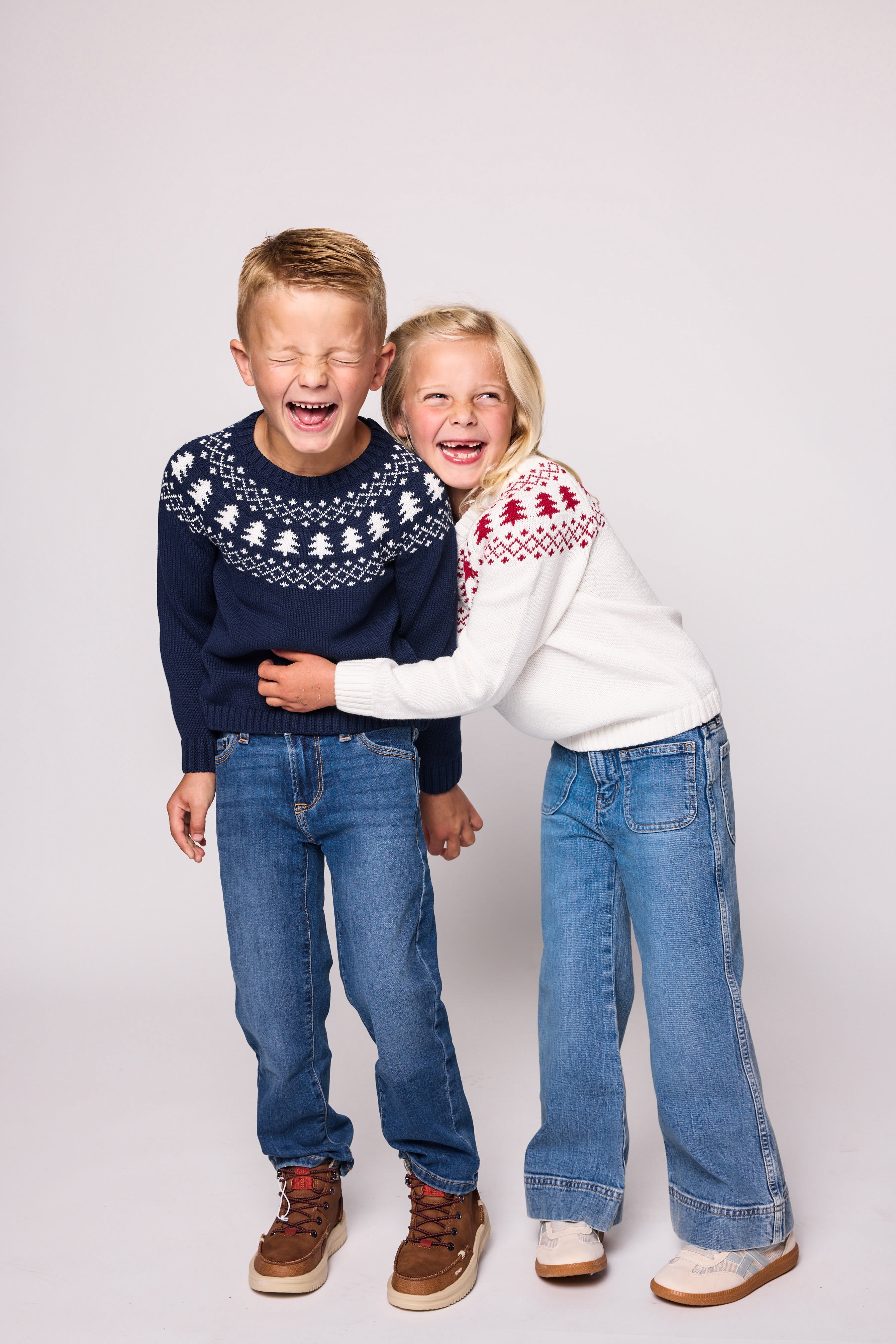 A little fair isle, a lot of fun. This kid's Fair Isle crew neck in navy with ivory detailing is a classic winter knit made for snow days, sled rides, and cocoa breaks alike. Crafted from 100% heirloom cotton, it’s soft, cozy, and ready for every kind of winter adventure, just like your favorite little one.