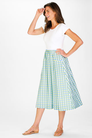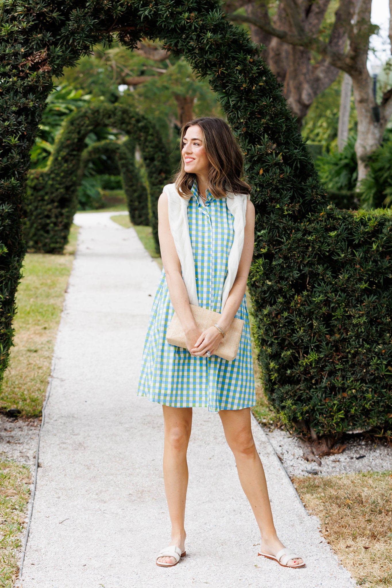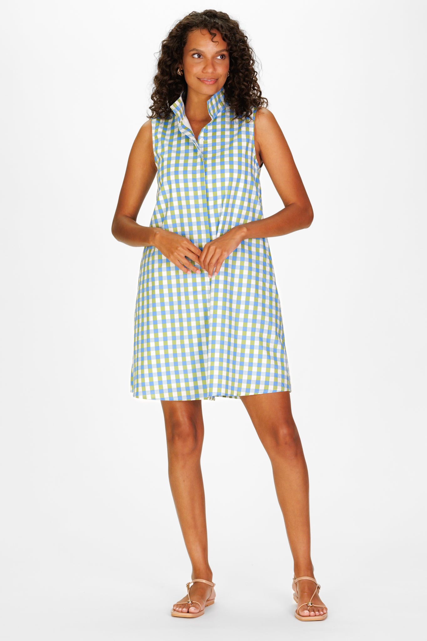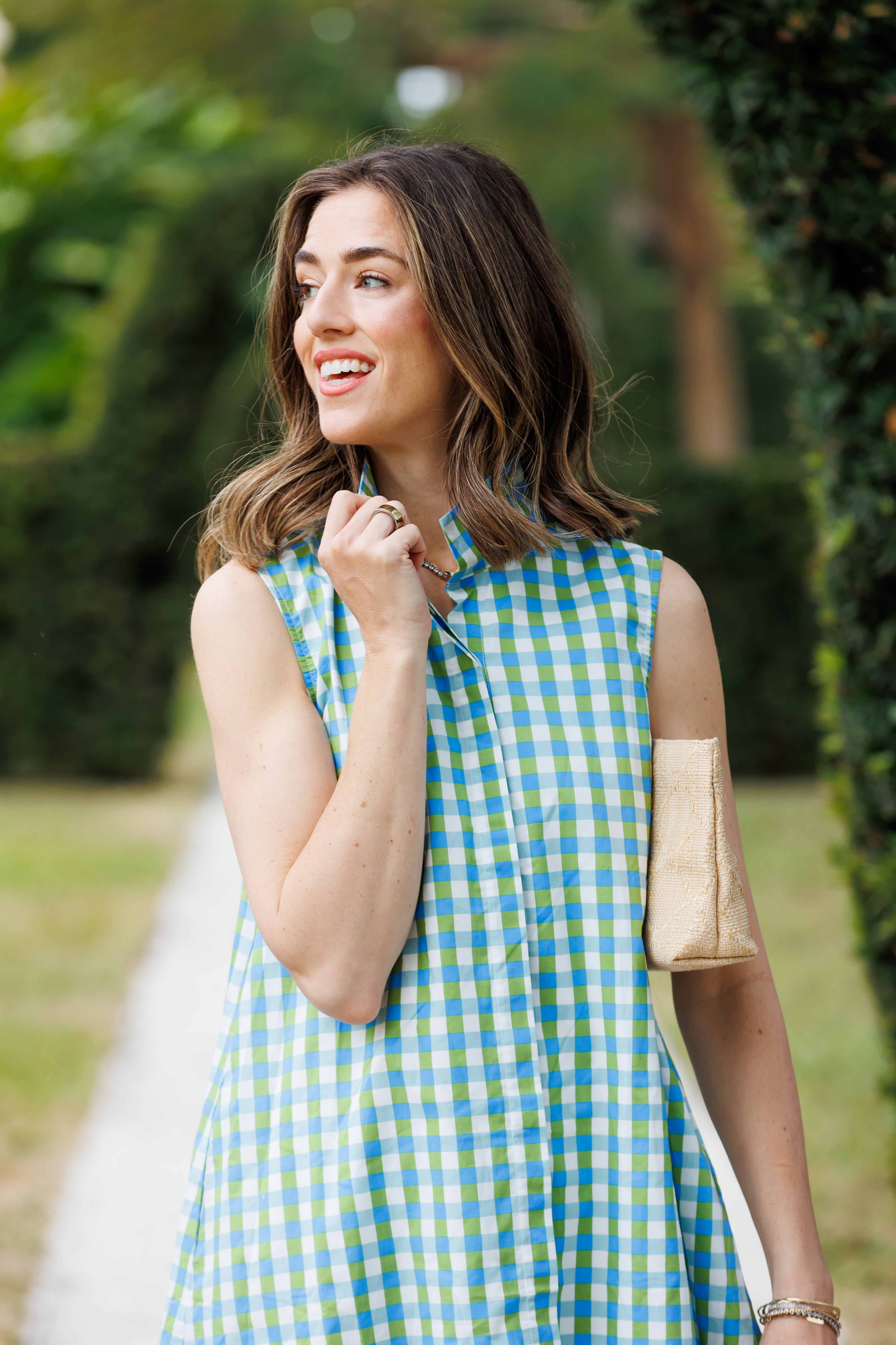 The women's Jan Dress is an instant classic designed for polished, everyday style. This women’s green and blue gingham dress features a flattering swing silhouette that moves beautifully while still offering a clean, tailored look. Crafted from lightweight, breathable cotton, it’s the perfect sleeveless spring and summer dress for warm days and effortless styling.