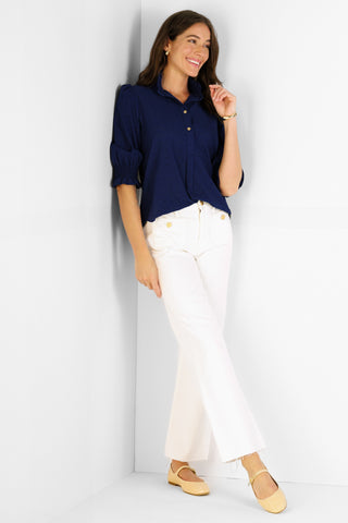 FEEL: Smooth, breathable, and just structured enough to hold its shape. Our navy eyelet delivers that classic, timeless texture with a soft touch and an easy, comfortable drape. Lightweight and breezy, it’s the fabric you’ll reach for all warm-weather seasons.
