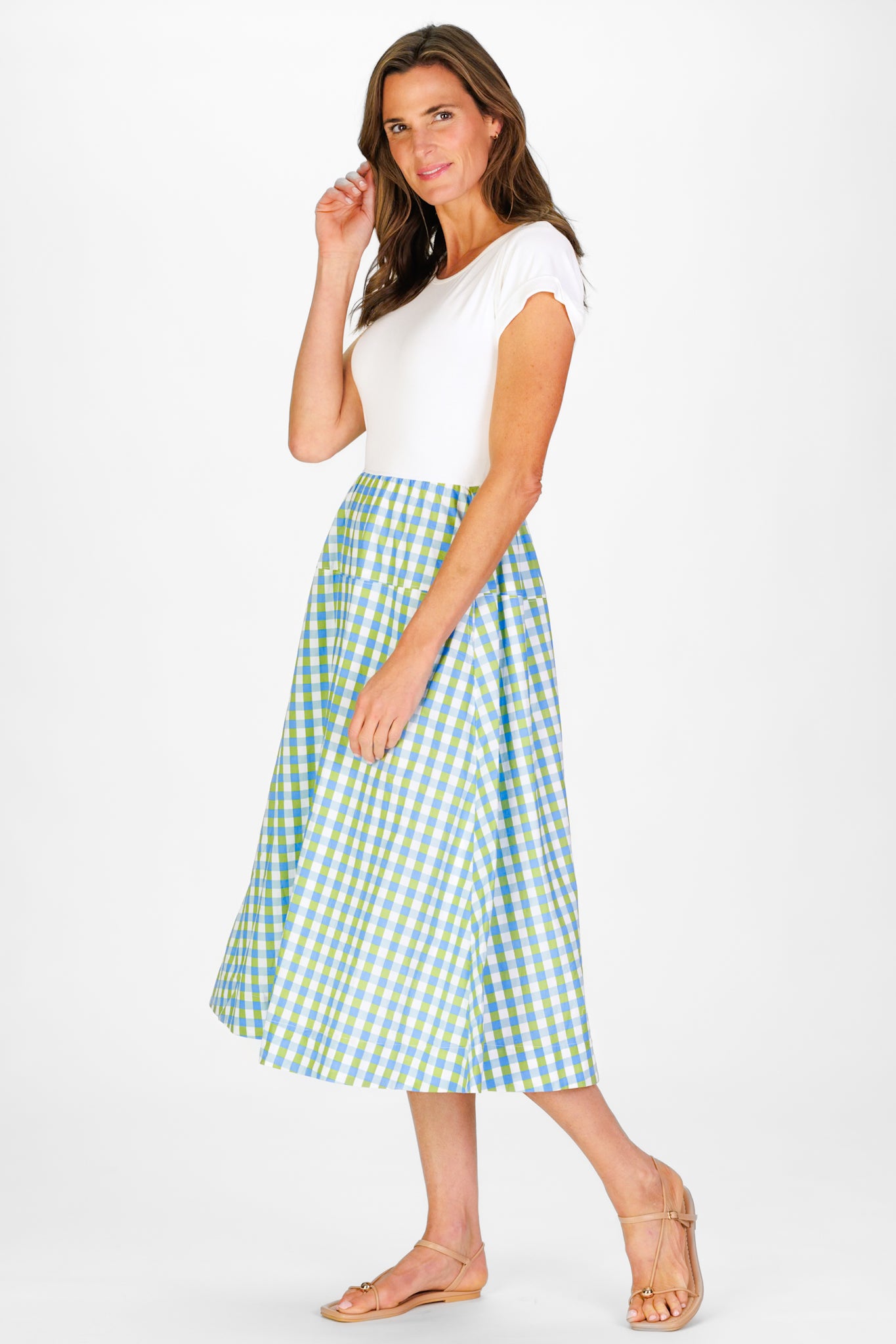 Just in time for warm weather, this women’s spring midi dress is a must-have for sunny days. Designed with a comfortable tee-style knit bodice and breezy cotton skirt, this lightweight gingham dress offers the perfect blend of style and ease. The flowy midi skirt in our Short Sleeve Jada Dress creates beautiful movement with every step, making it an effortless choice for everything from farmers market strolls to weekend brunch or casual summer outings.