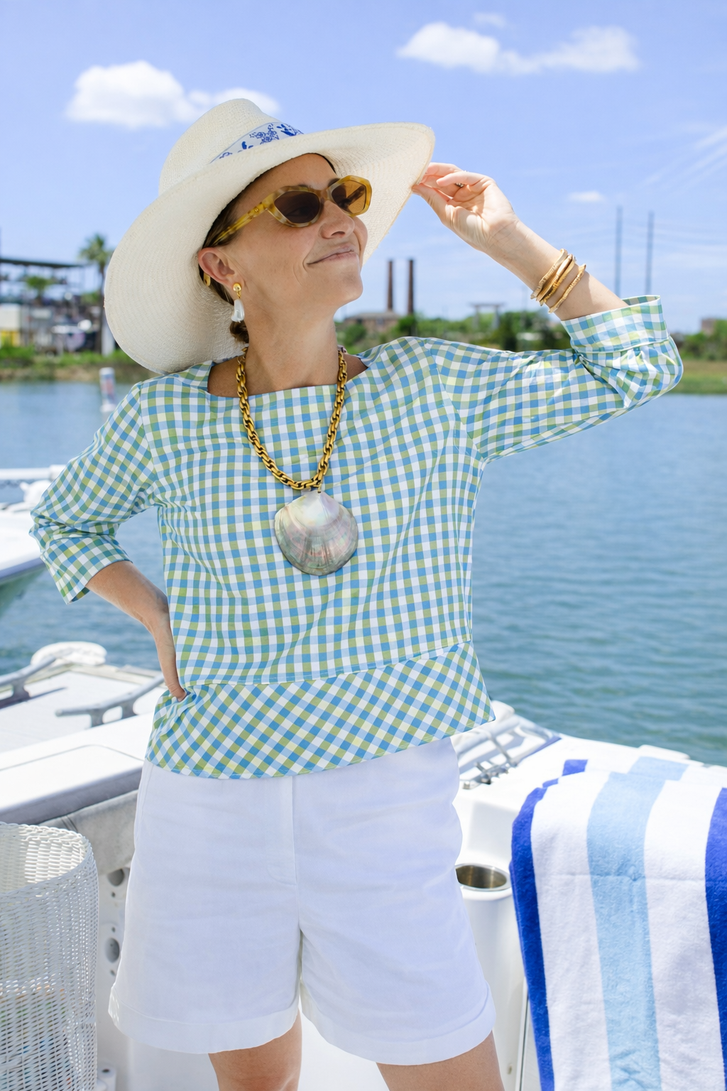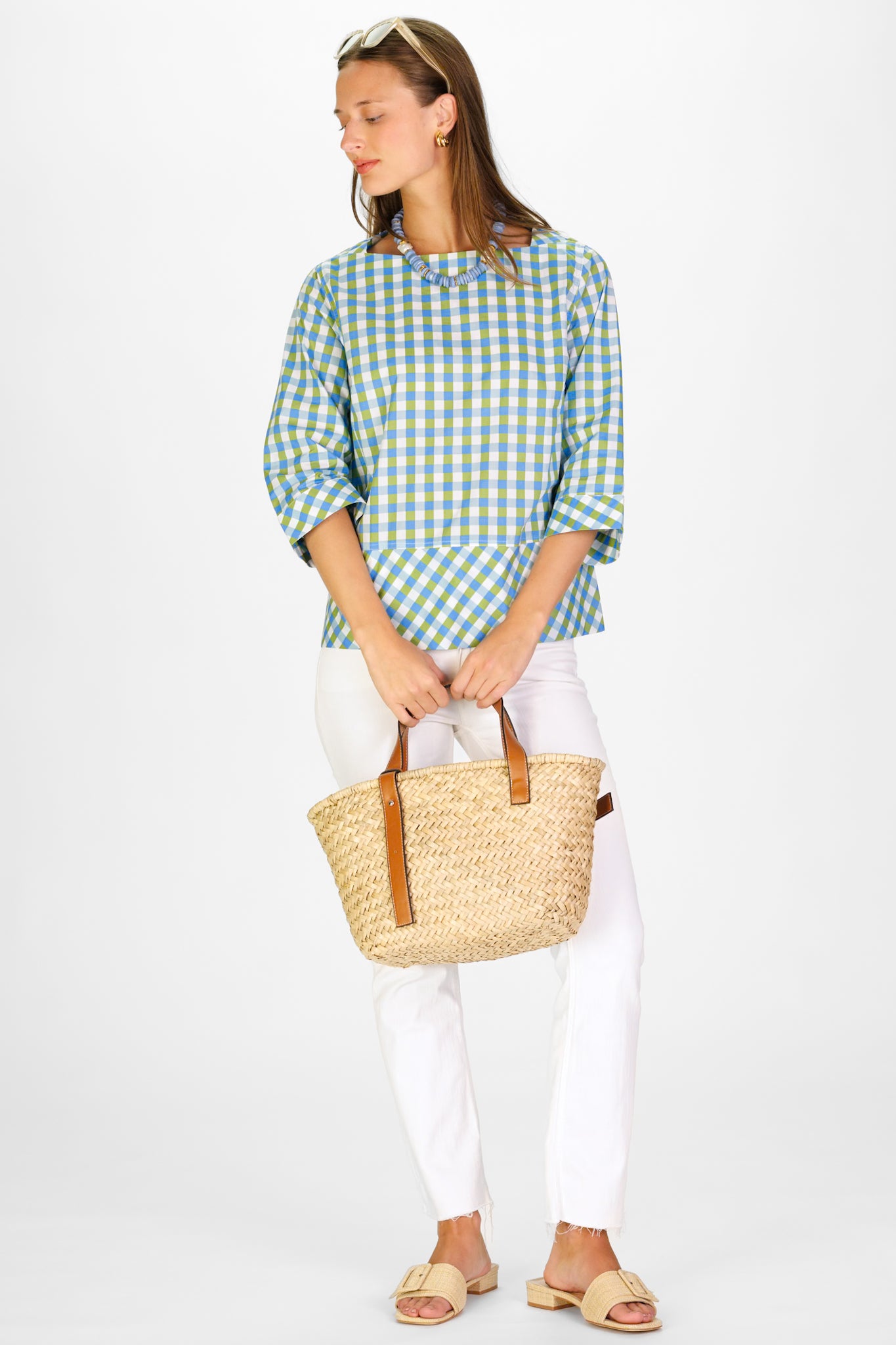 Nothing says spring quite like a classic gingham top. The Tilda Top brings effortless style with its fresh green and blue gingham pattern and relaxed silhouette designed for everyday comfort. This women’s cotton gingham blouse features a feminine boat neckline and an easy drape that feels perfect for warm, sunny days.